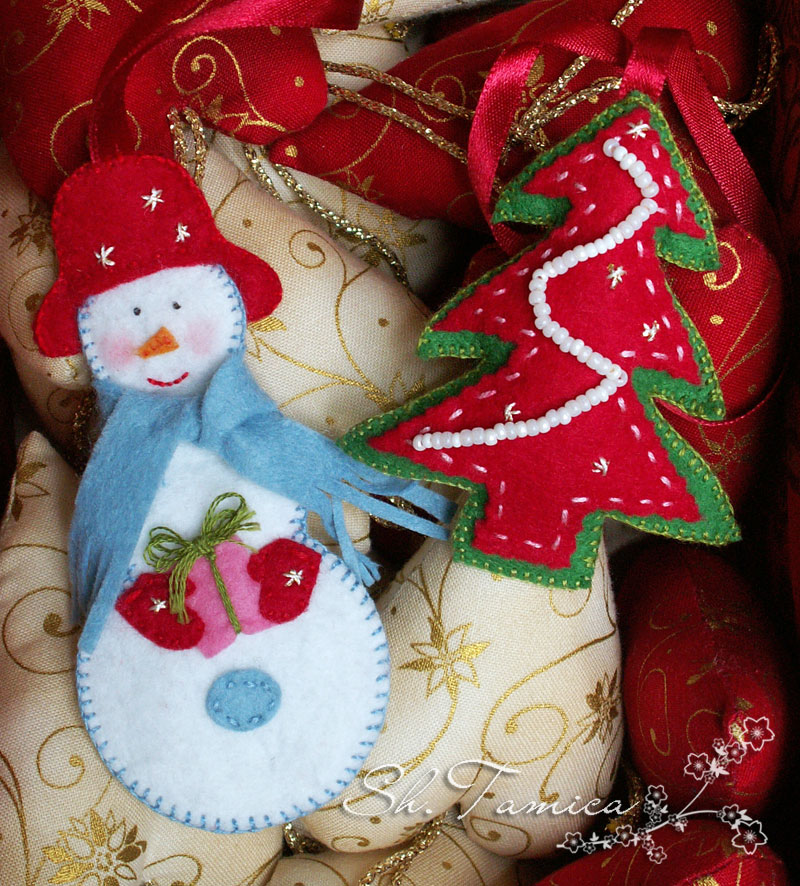 Вот две моих прошлогодних новогодних подвески из фетра: снеговик и ёлка.